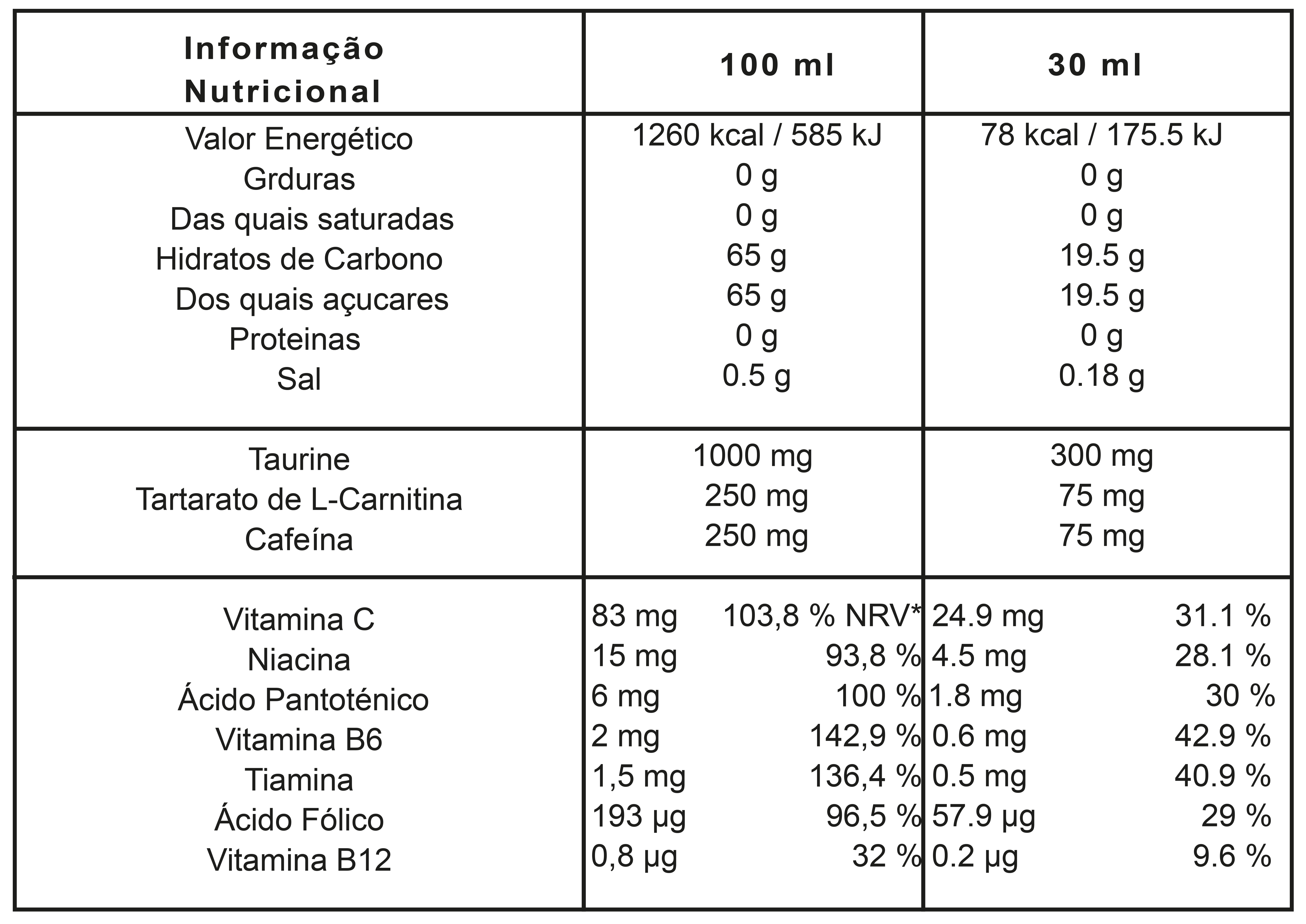 Xarope de açúcar invertido (máx. 70% de matéria seca), acidificante (ácido cítrico), pré-mistura vitamínica e mineral (citrato trissódico, cloreto de sódio, cloreto de potássio, citrato tricálcico, vitamina C, citrato trimagnésio, niacina, ácido pantotênico, vitamina B6, tiamina , vitamina B12, ácido fólico), sabor a frutos silvestres (contém E160a, E133) sabor a sabugueiro com limão (contém E122*, E124*, E133), taurina, tartarato de L-L-carnitina, cafeína, edulcorantes: sucralose, acessulfame de potássio.