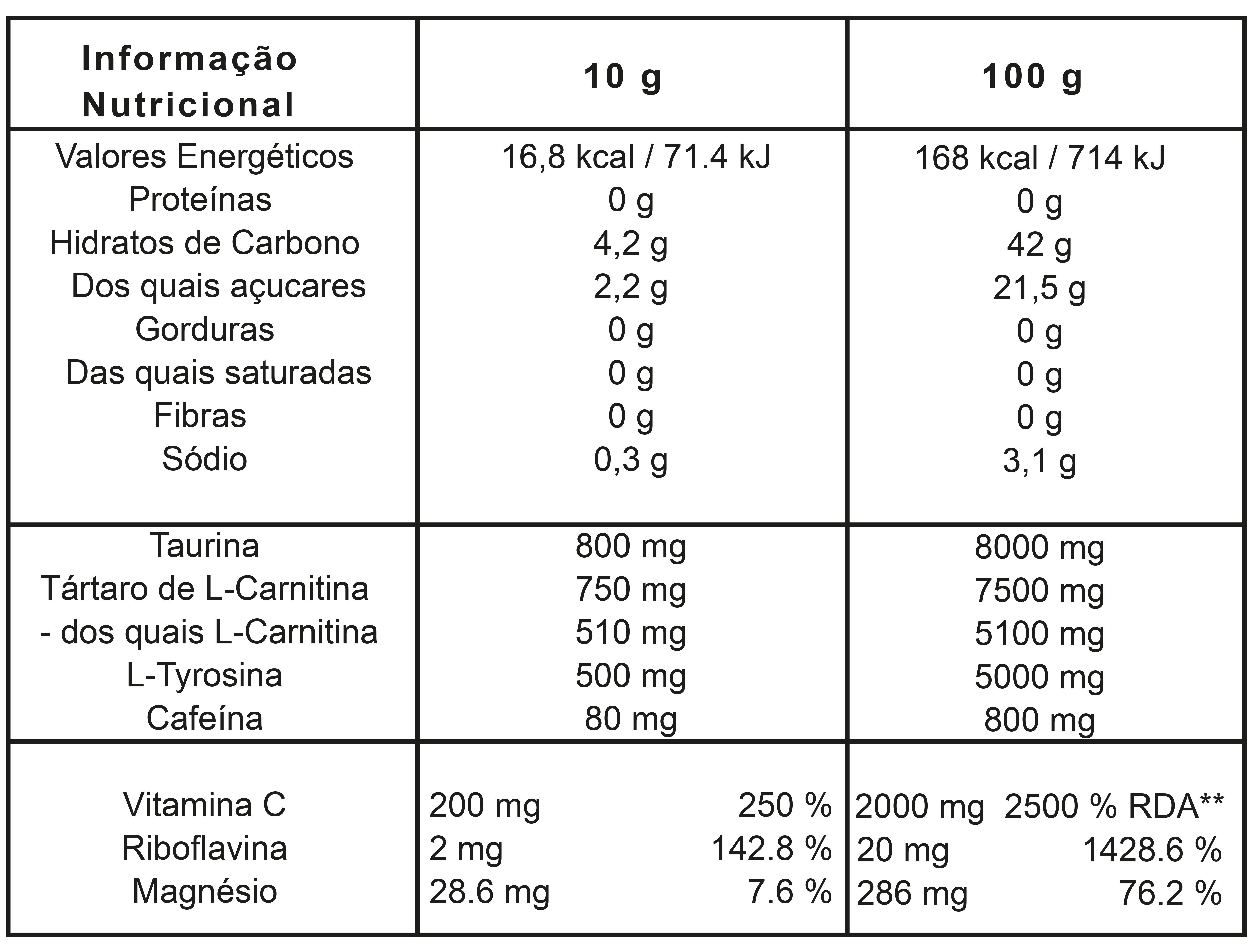 Maltodextrina, acidificantes (ácido cítrico, ácido málico), corrector de acidez (bicarbonato de sódio), taurina, tartarato de L-carnitina, L-tirosina, quitosano, ácido ascórbico (vitamina C), antiaglomerantes (carbonato de magnésio, fosfato tricálcico), sabores (limão, lima), cafeína anidra, edulcorantes (sucralose, acessulfame de potássio), cor (riboflavina).