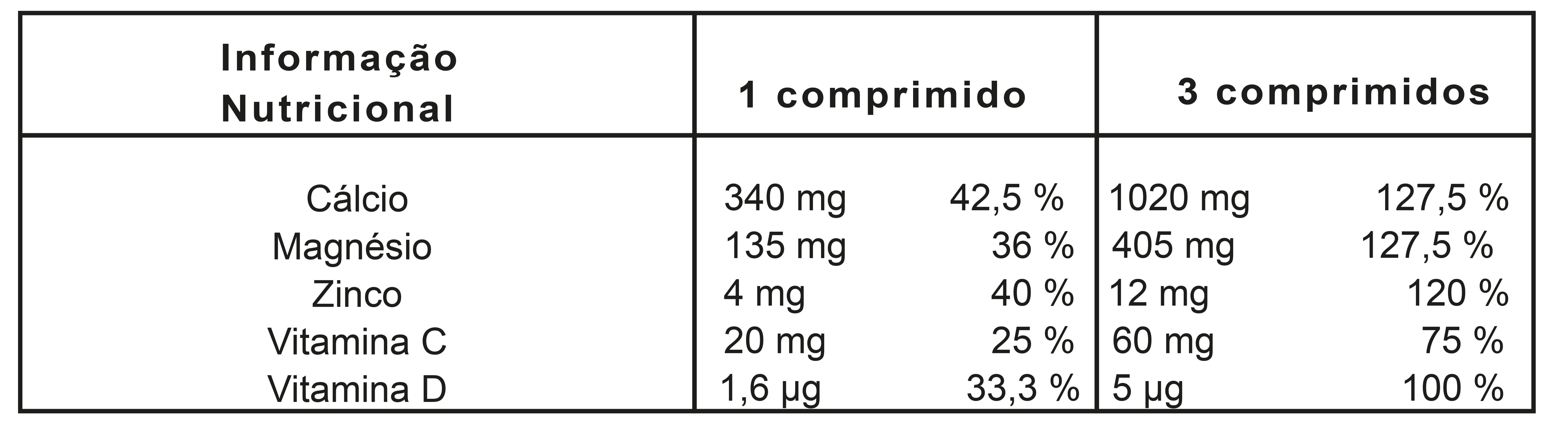 Lithothamnium calcareum pó de algas vermelhas 2000 mg dos quais cálcio 640 mg (80 %*) e magnésio 60 mg (16 %*), zinco (de citrato de zinco) 5 mg (50 %*), vitamina D3 (colecalciferol) 2, 5 μg (50%*). Ingredientes inativos: invólucro da cápsula (gelatina, corante: dióxido de titânio).