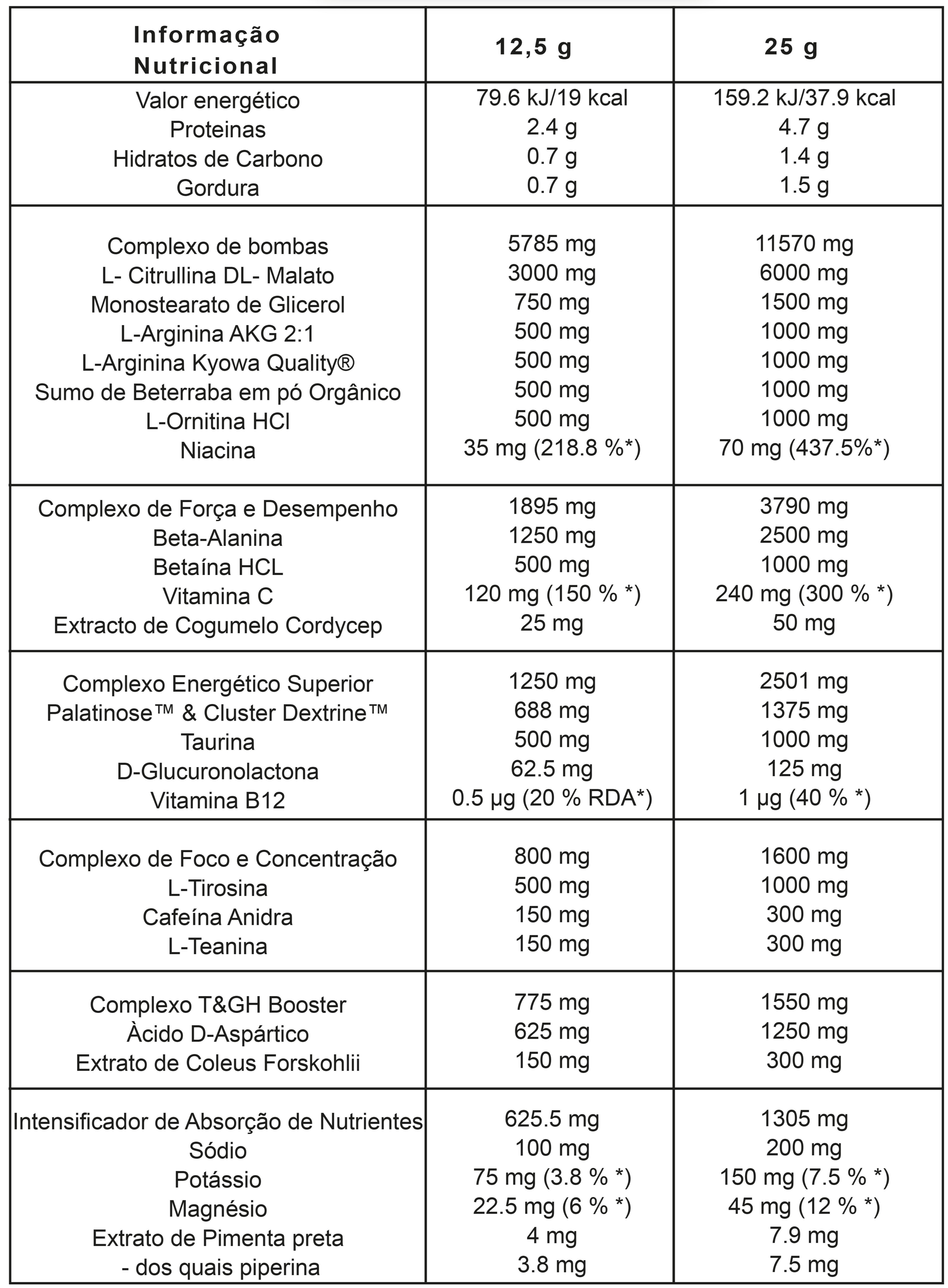 Consumir 1-2 porções (12,5 g – 25 g) por dia 20-30 minutos antes do treino. O tamanho da porção pode ser modificado com base no peso corporal, necessidades individuais, intensidade planeada do exercício e sensibilidade aos ingredientes do produto.