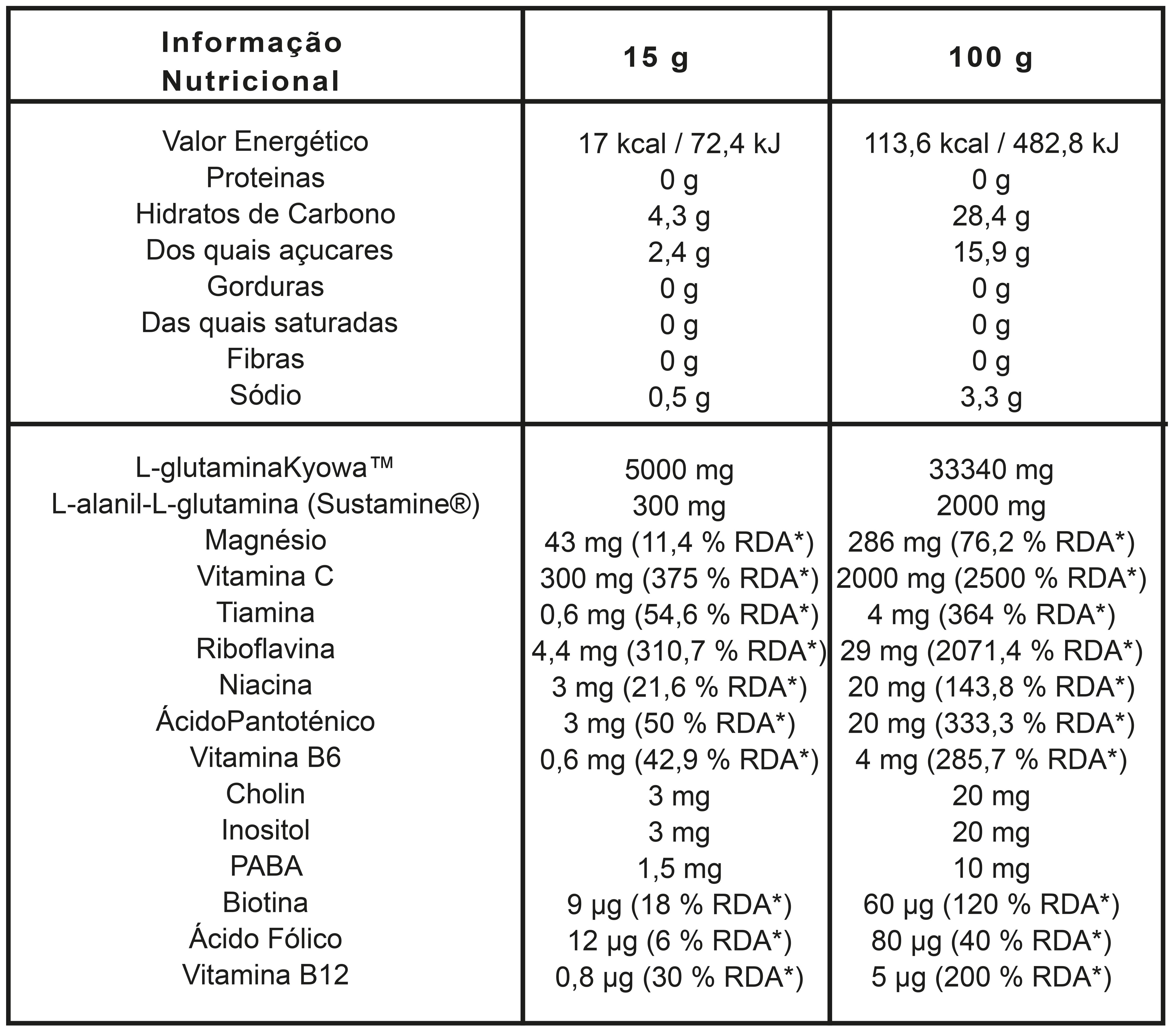 Maltodextrina, L-glutamina, conservante: ácido cítrico, regulador de acidez: bicarbonato de sódio, NRG (taurina, glucuronolactona, cafeína, inositol, nicotinamida, vitamina B6, vitamina B2, vitamina B12, pantetonato de D-cálcio, aroma), antioxidante: ácido ascórbico , antiaglomerante: carbonato de magnésio, edulcorantes: sucralose, acessulfame de potássio, corante: riboflavina.