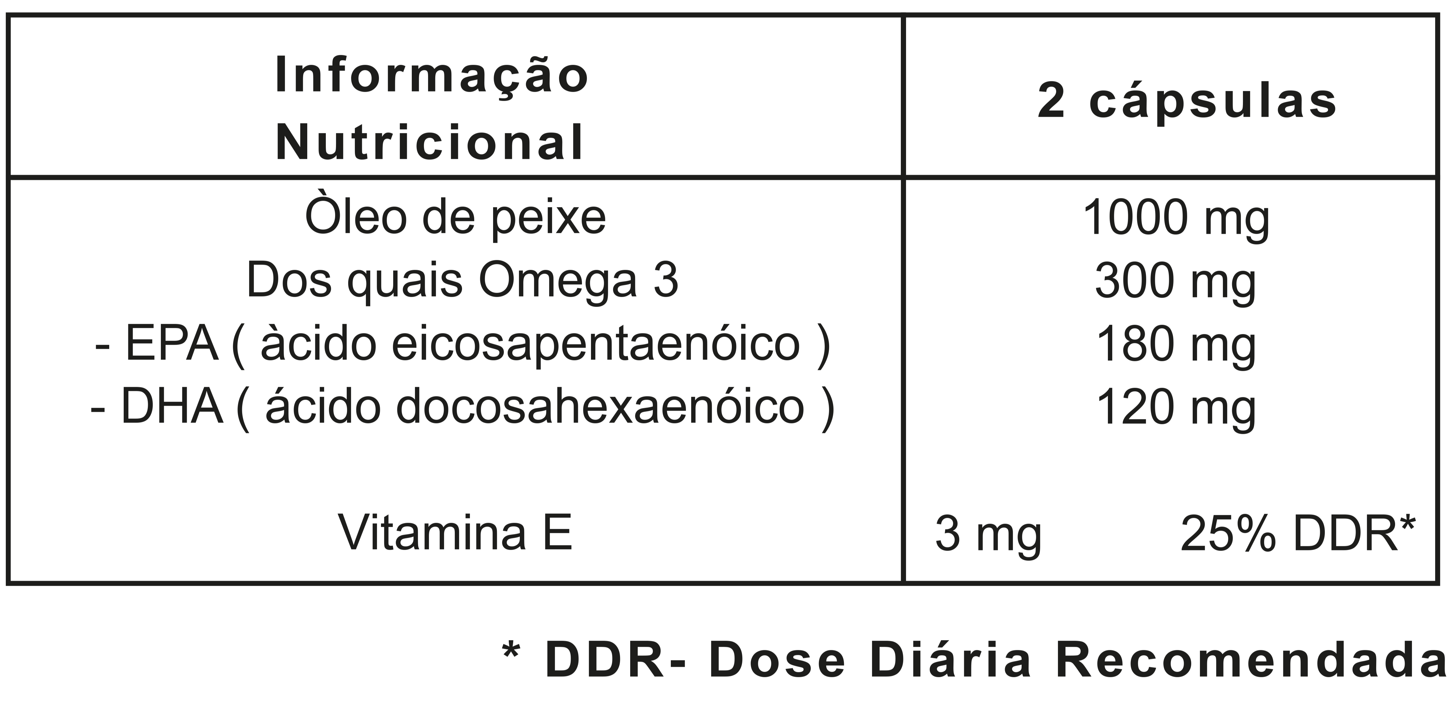 Óleo de peixe, vitamina E. Ingredientes inativos: invólucro da cápsula (gelatina, água, glicerina).