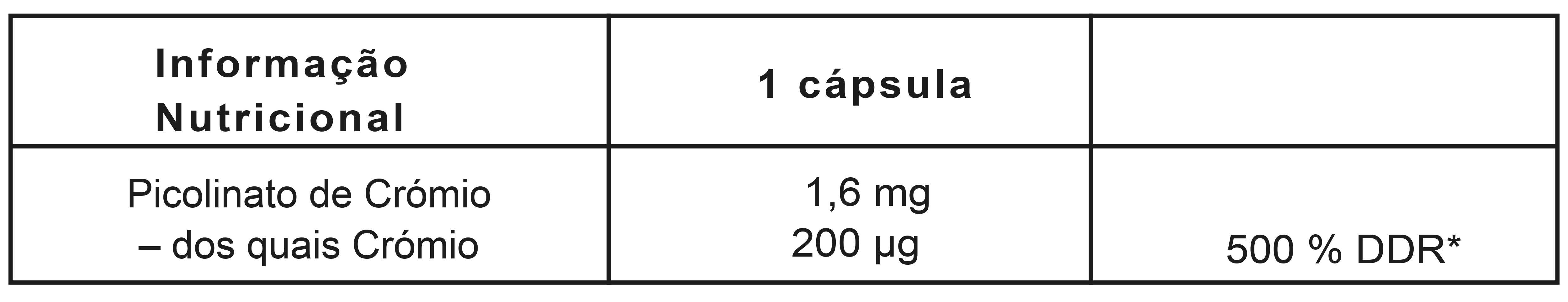 Picolinato de crômio. Ingredientes inativos: agente de volume (maltodextrina), invólucro da cápsula (gelatina).