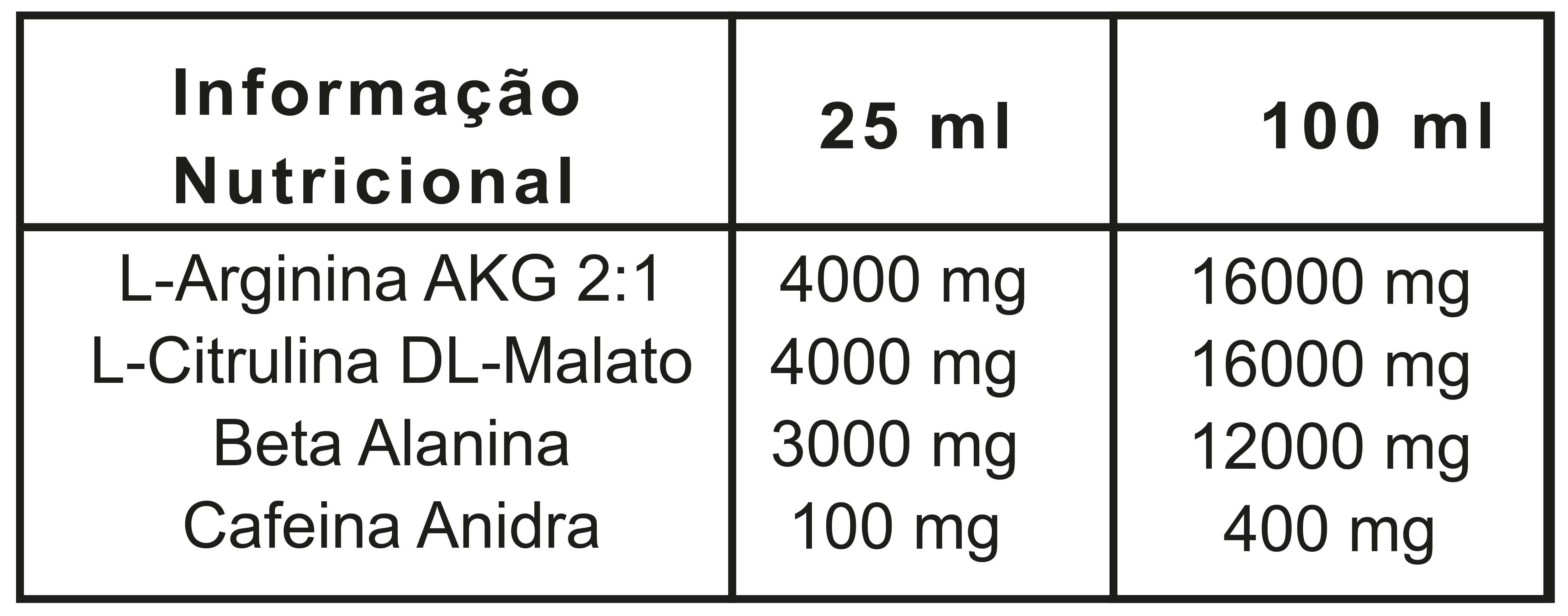 Água purificada, L-arginina AKG 2:1, DL L-citrulina malato, beta alanina, cafeína anidra, sabor cola, edulcorantes (sucralose, acessulfame de potássio), conservantes (sorbato de potássio, benzoato de sódio), corante caramelo E150d .