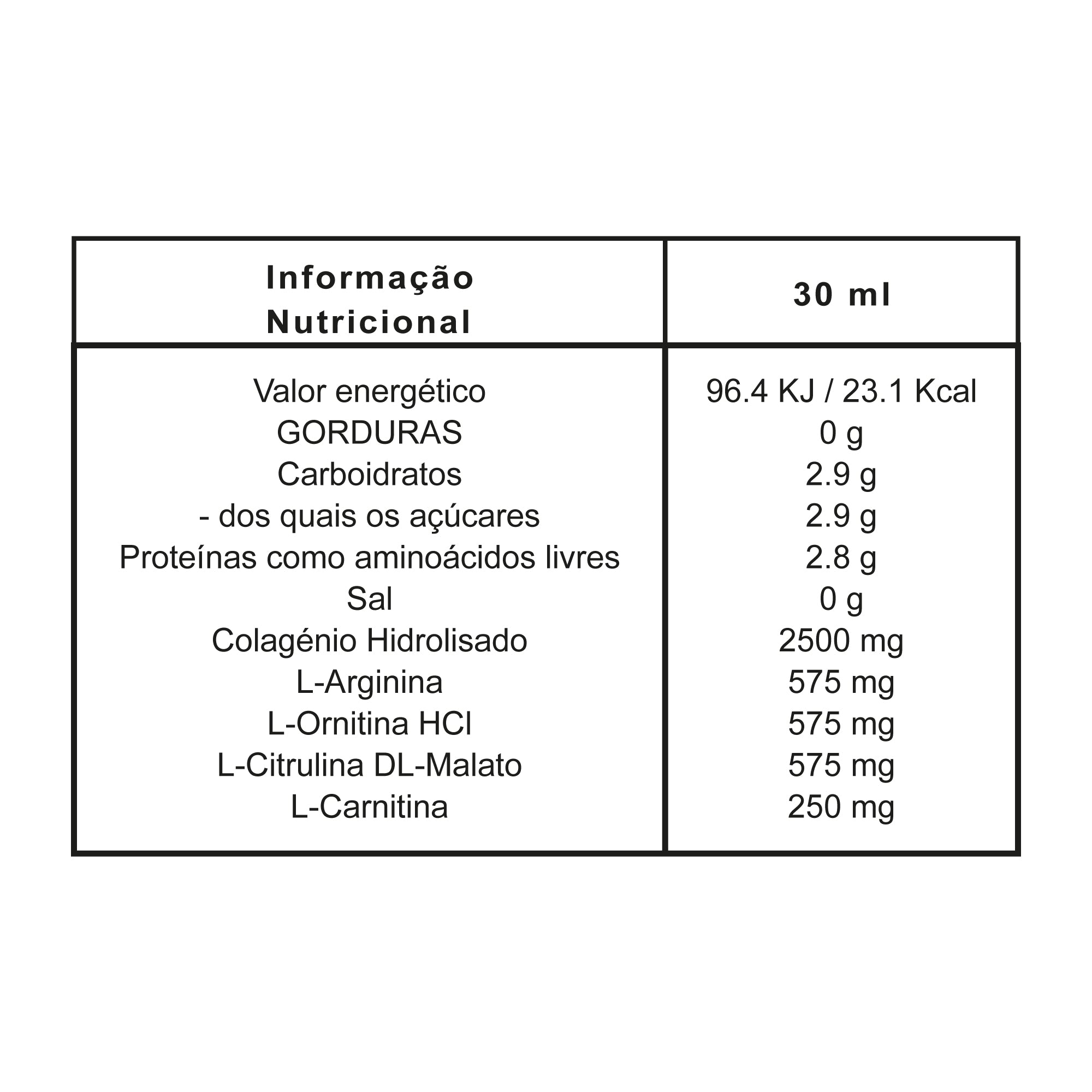 Água purificada, xarope invertido, colagénio hidrolisado, L-Arginina, L-Ornitina HCl, L-Citrulina DL-malato, L-Carnitina, acidificante (ácido láctico), espessante (sorbitol), aroma de uva, conservante (sorbato de potássio), adoçante (glicosídeos de esteviol).