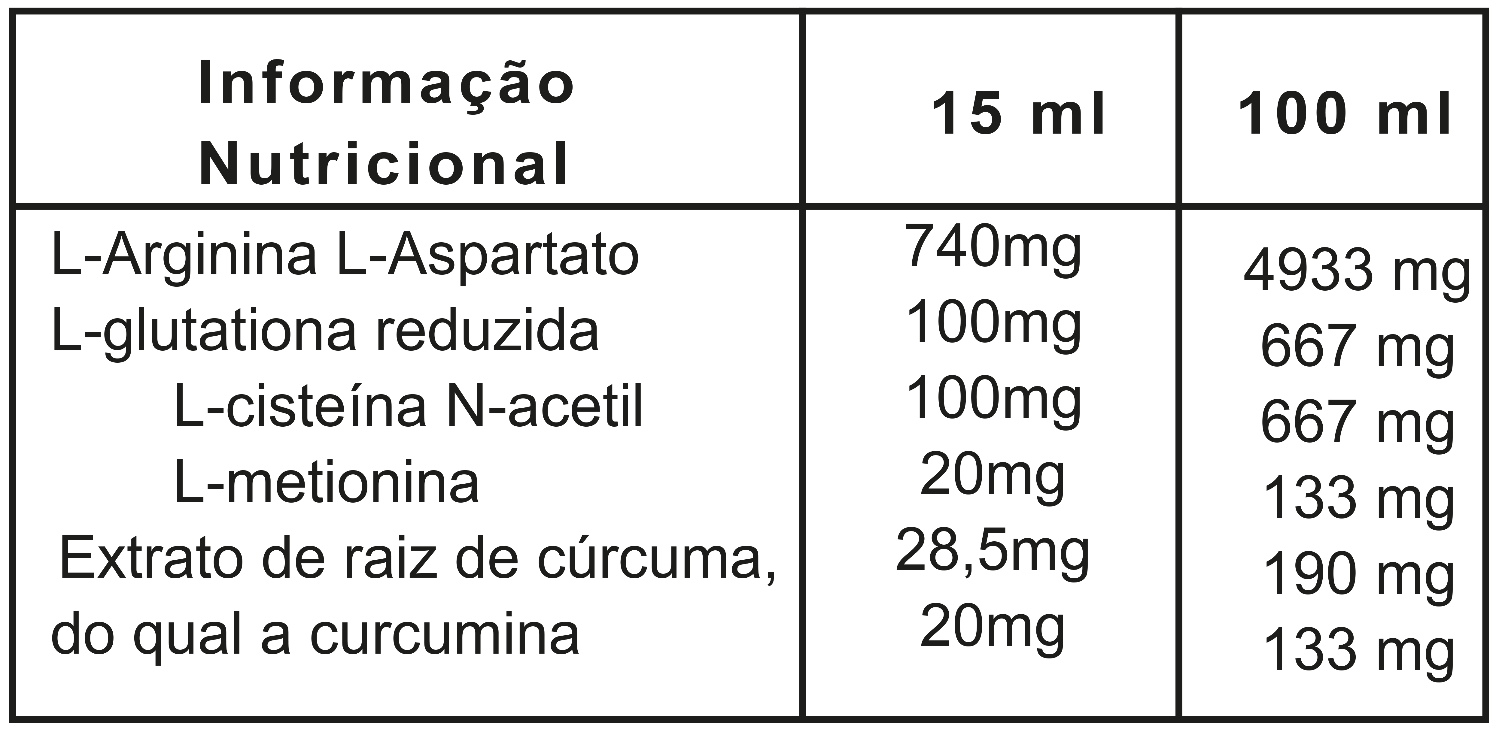 Composição da cápsula: L-arginina L-aspartato, L-glutationa reduzida, N-acetil L-cisteína, extrato de raiz de cúrcuma (Curcuma Longa Linn., min. 70% de curcumina), L-metionina, agente antiaglomerante (fosfato tricálcico) , adoçante natural (extrato de folha de estévia - Stevia rebaudiana, 97% rebaudiosídeo A). A composição da garrafa: água, conservantes (sorbato de potássio, benzoato de sódio).