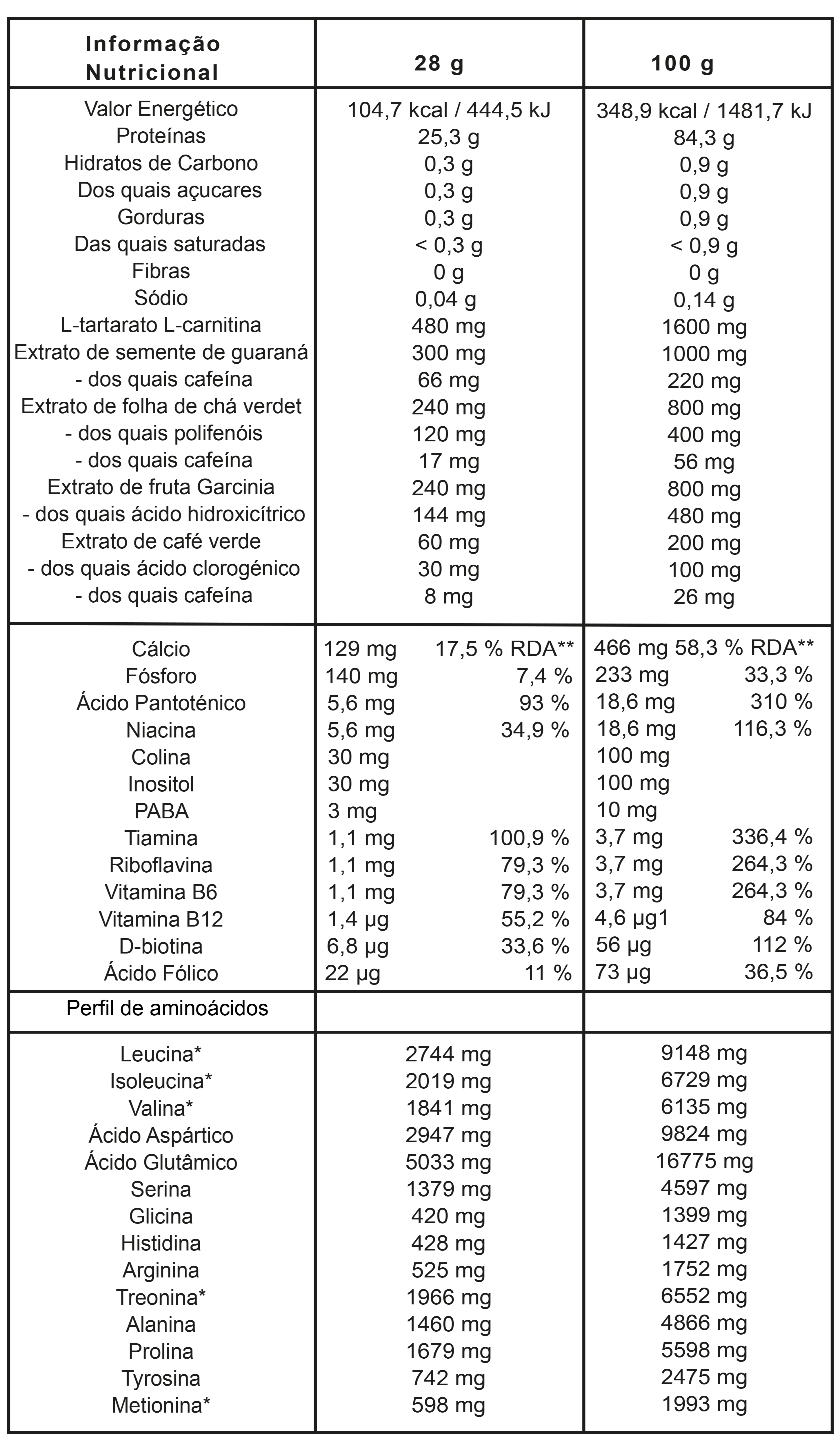 Isolado de proteína de soro de leite microfiltrado (contém emulsificante: lecitina de soja), L-carnitina L-tartarato, cor E 141 (ii), aromas, extrato de semente de guaraná (Guarana Paullinia cupana Kunth, 22% de cafeína), extrato de folha de chá verde (Camellia sinensis, 50% polifenóis, 7% cafeína), extrato de fruta garcinia (Garcinia Cambogia, 60% ácido hidroxicítrico), extrato de grão de café verde (Coffea Arabica L., 50% ácido clorogênico, 13% cafeína), complexo vitamínico B (D-pantetonato de cálcio , nicotinamida, inositol, bitartarato de colina, ácido para-aminobenzóico, cianocobalamina, mononitrato de tiamina, riboflavina, cloridrato de piridoxina, ácido pteroilmonoglutâmico, D-biotina), edulcorantes (sucralose, acessulfame de potássio), picolinato de cromo.